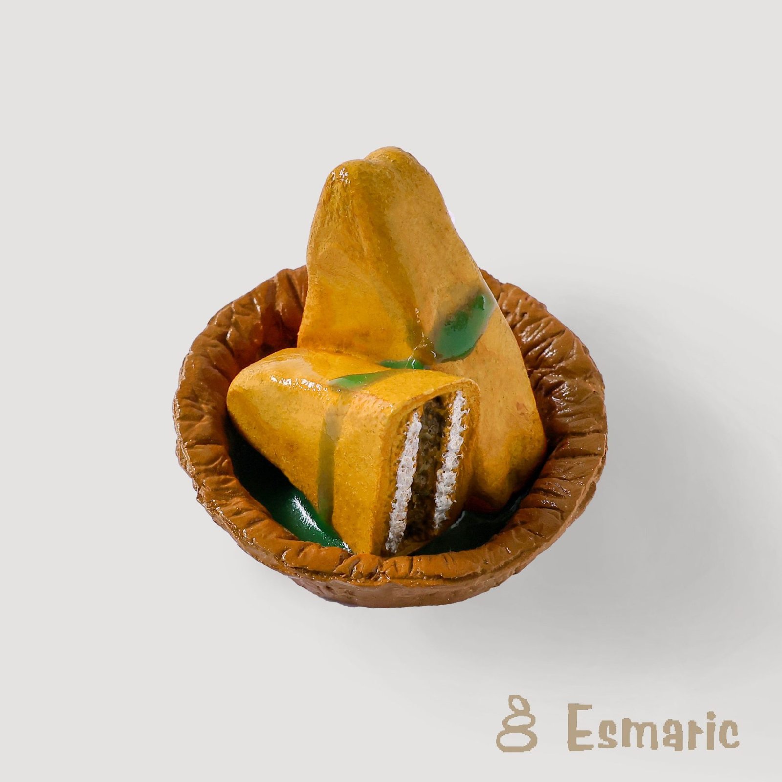 Bread Pakora, a savoury delight cherished in the hearts of North Indians! With its crispy exterior and soft interior, these golden-brown treats are stuffed with a flavourful potato mixture and coated in a chickpea batter. This miniature fridge magnet captures the essence of this beloved Indian street food. Each miniature is crafted with intricate detail, serving as a delightful reminder of the crispy and flavourful goodness of Bread Pakora. Whether for adding culinary charm or gifting to food enthusiasts, these miniatures are perfect. Bring home the crisp and flavoruful taste of love with our Bread Pakora miniatures.